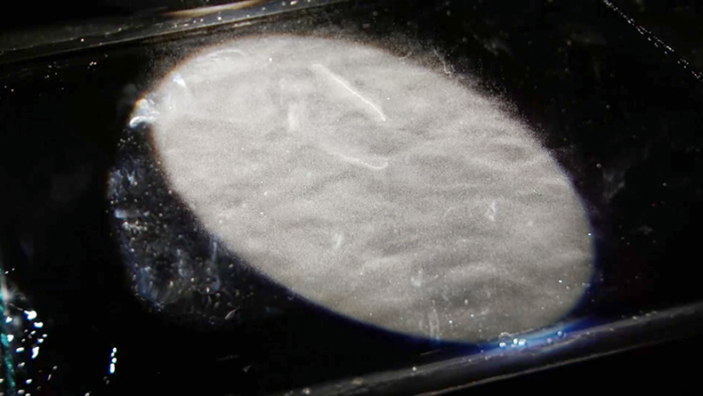 The experiment recreated in The Origin of Clouds uses saturated fumes of isopropyl alcohol that lied over a frozen plate inside a sealed glass chamber. The alcohol forms a thing layer over the cooled surface, and with the help of a strong source of light, different elemental particles start to emerge. These particles – muons and electrons – are a consequence of Cosmic Rays originating in the sun and outside the solar system. The average speed of these particles is 299.400 km/s (close to the speed of light).